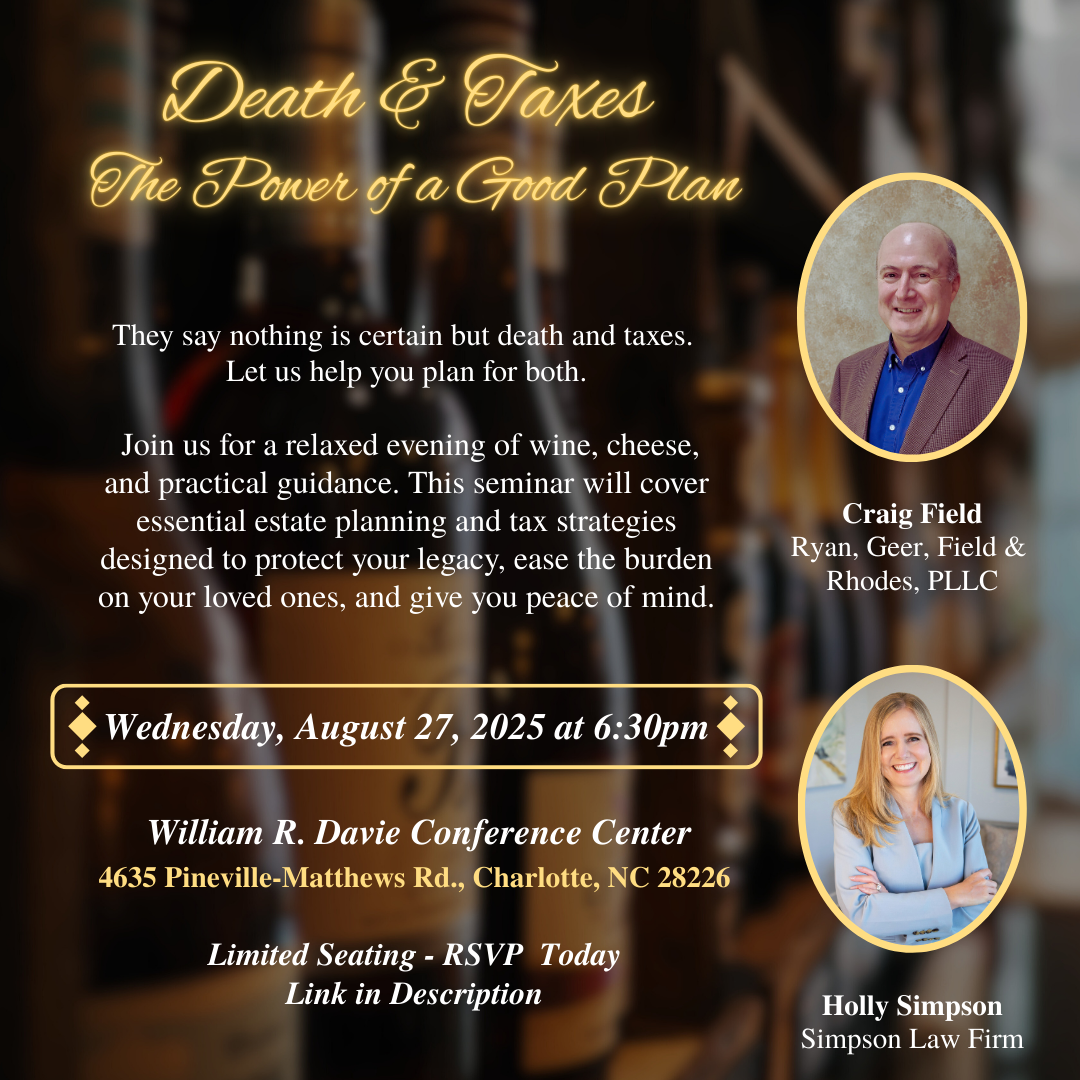 They say nothing is certain but death and taxes. Let us help you plan for both. Join us for a relaxed evening of wine, cheese, and practical guidance. This seminar will cover essential estate planning and tax strategies designed to protect your legacy, ease the burden on your loved ones, and give you peace of mind.